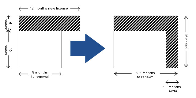 Assume the original purchase included ten APs, each with a 1-year license. Also assume four months into the license term there are six additional APs added, each with a 1-year license. Extra credit is applied with value of 4 additional months * 6 additional APs = 24 additional 'AP-months'. This gives an additional 24 months / 16 total AP's in the organization = an additional 1.5 months to the license term for the whole organization.