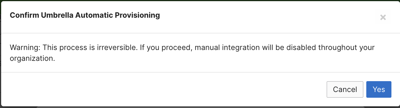 Warning: If Automatic Umbrella is explicitly provisioned, using Manual integration with Umbrella in such organizations will not be possible. This process is irreversible.