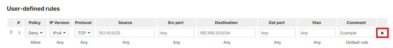 To delete a rule from the ACL, select the x symbol to the far right of the rule.