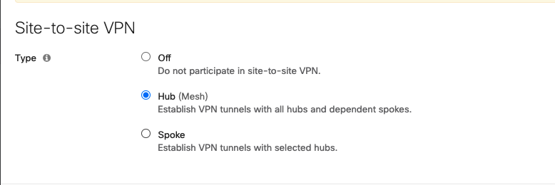1. A Hub, Select one of the Connector networks and navigate to the Site-to-site VPN page, Security & SD-WAN > Configure > Site-to-site VPN