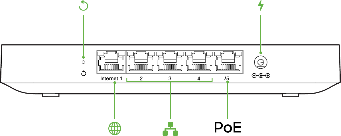 [Port 5] One of the LAN ports provides PoE+ for connectivity to computers, printers, access points, or Ethernet switches, up to 30W of PoE power. A steady green LED indicates bidirectional connectivity, and flashing green indicates traffic. |